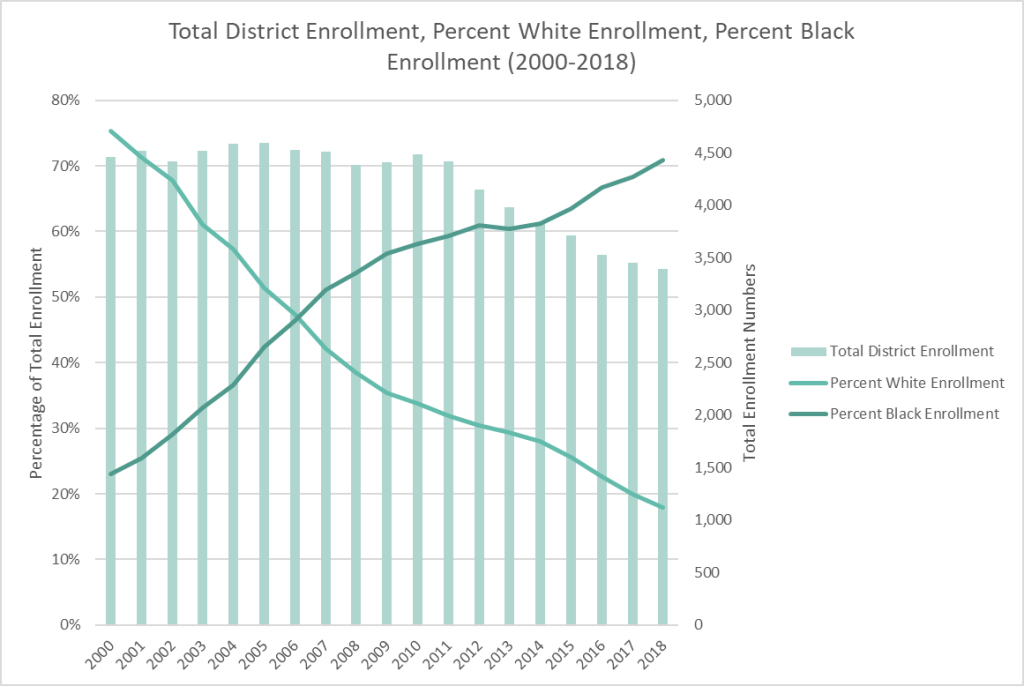 During the last two decades, enrollment in South Euclid-Lyndhurst schools has declined, students qualifying for free and reduced lunch has increased exponentially, and the racial makeup of the schools has dramatically shifted—from 75% white for the class of 2000 to 16% white for the class of 2018.