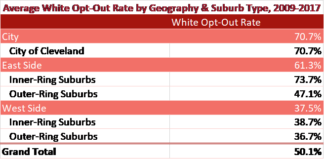 A notable exception to this trend on the east side inner-ring of Cleveland is the Shaker Heights City School District, which has a white opt-out rate of 47%; this is the only east-side inner-ring suburb with an opt-out rate less than 50%. Shaker Heights schools has put forth a notable effort of promoting and managing diversity within the district for decades, and those efforts have obviously been fruitful. To put into perspective just how dire the situation on the east side inner-ring is, the west side suburbs overall have an average white opt-out rate of 38% and the east side outer-ring suburbs have an average white opt-out rate of 47%–the same as Shaker Heights.