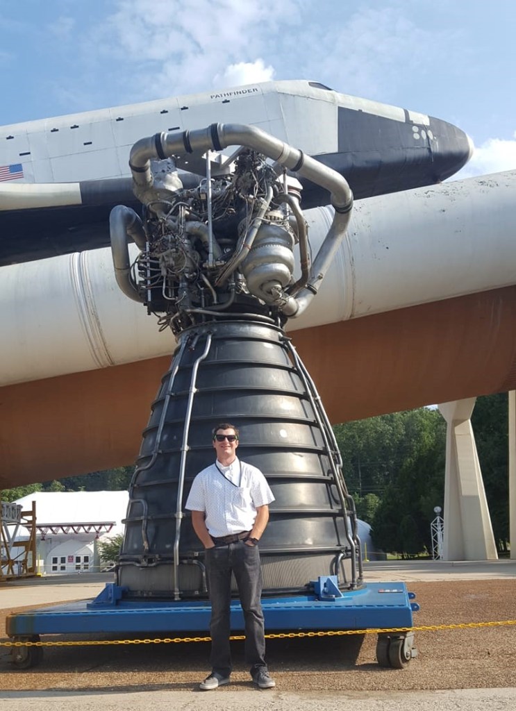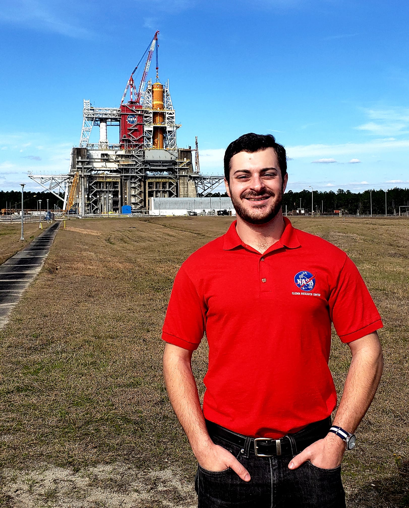 Scott Karn in front of a NASA rocket test stand at Stennis Space Center in Mississippi